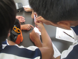 理科室では6年生がリトマス試験紙を使って水溶液の仲間分けをしていました。